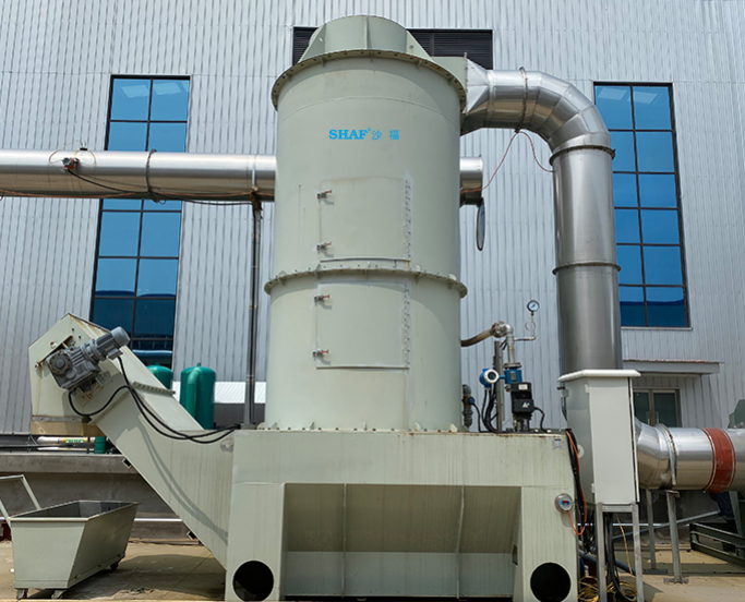 除塵系統(tǒng)運行中,收集罩把粉塵產(chǎn)生源將煙塵/粉塵捕集起來,通過管道系統(tǒng)輸送到分離器的進(jìn)風(fēng)口,之后進(jìn)入噴淋區(qū)域,在最近的位置通過氣